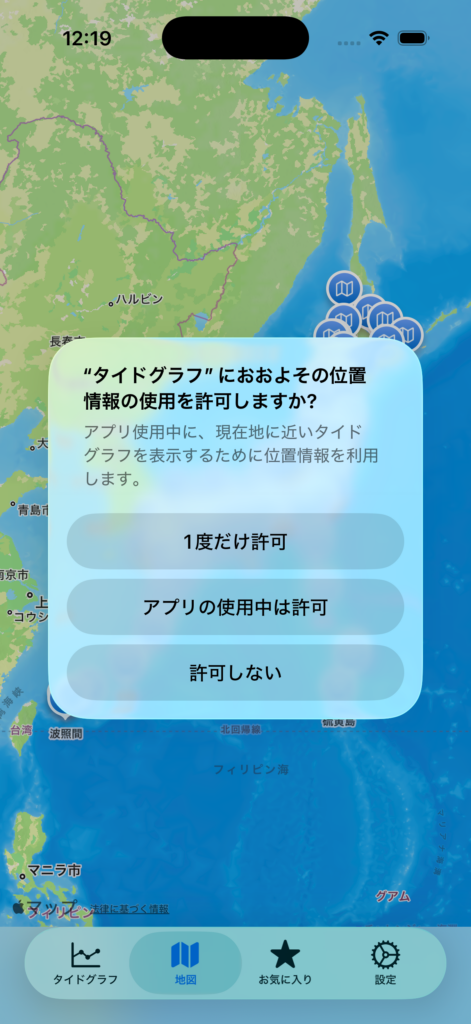 いずれにしても、おそらくこのタイドグラフアプリが利用されるシチュエーションでは、そこまで厳密な位置情報の取得は必要ないと考えています。